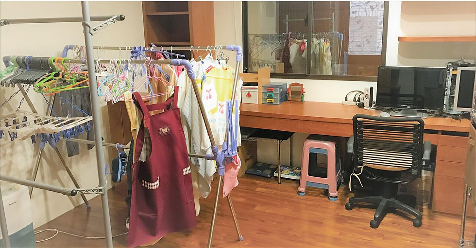 原本規劃為收納室兼媽媽的書房,因為雜物日積月累,和常態除溼衣服的需要,漸漸的,書桌功能荒廢,物品四處堆放,除溼衣物也因沒有固定場域而四處懸掛。